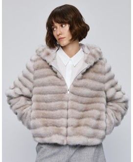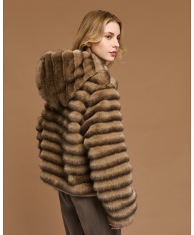 Κοντό τζάκετ από συνθετική γούνα με μακριά μανίκια και πλαϊνές τσέπες. Διαθέτει κουκούλα, ενσωματωμένη φόδρα και κλείσιμο με φερμουάρ μπροστά. Ιδανική επιλογή για κομψές και εντυπωσιακές επίσημες εμφανίσεις.